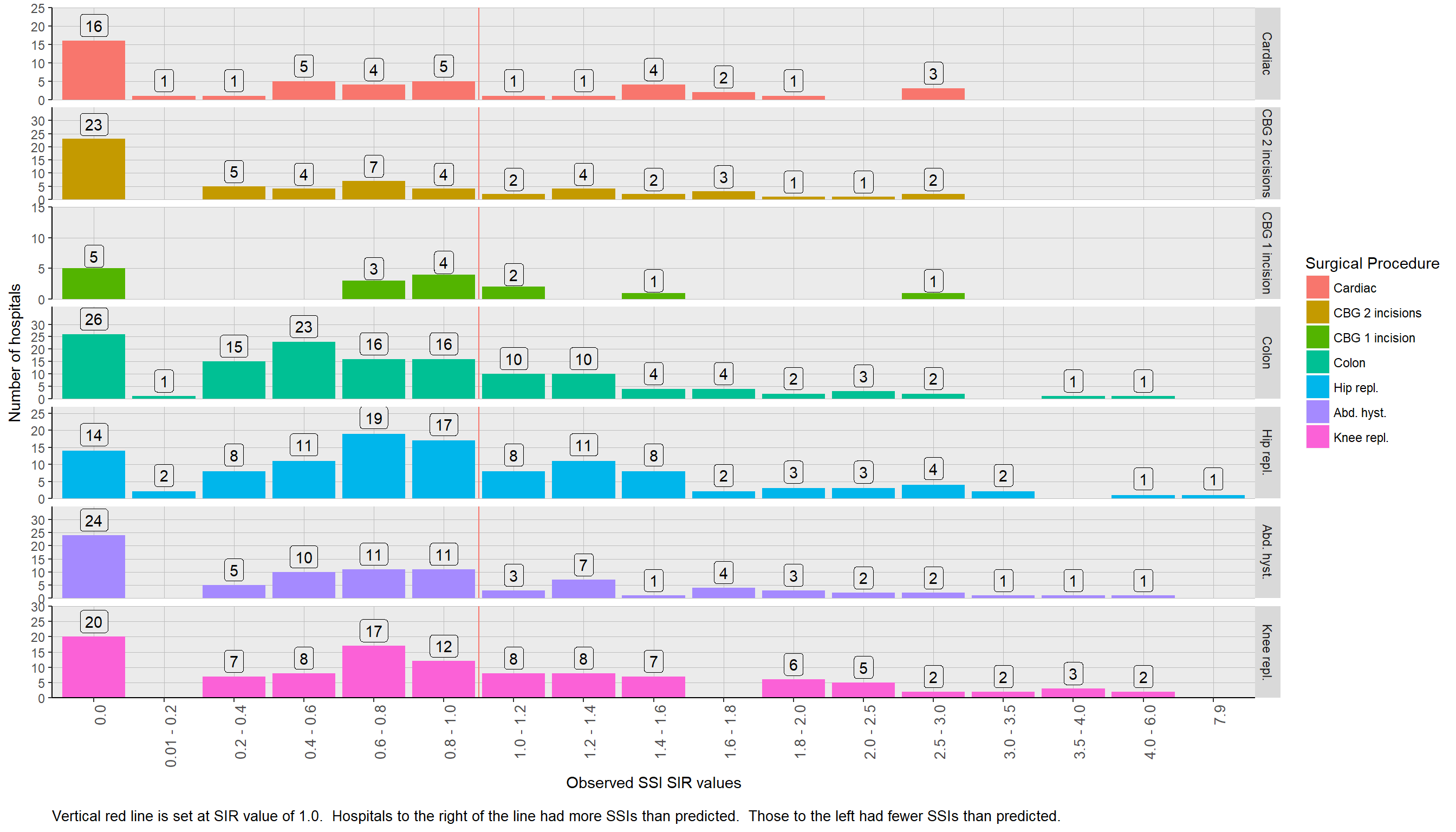 Table A3, below, shows the number of hospitals with statistically significant SSIs. More hospitals have SIRs that are significantly lower than predicted by the 2015 national experience than those with SIRs significantly more than the 2015 national experience.