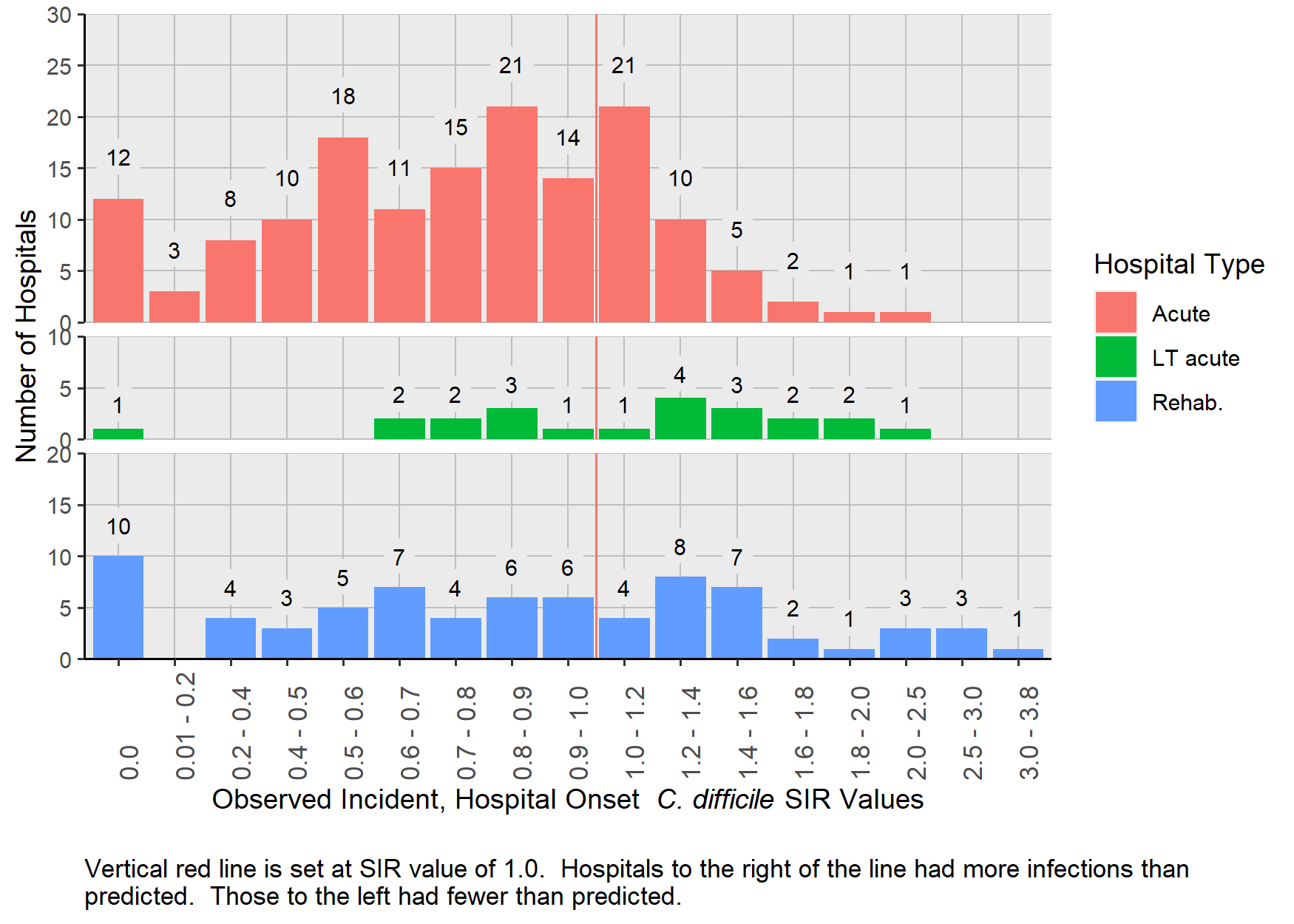 Figure 6 shows the distribution of CDI SIRs for ACH, LTAC hospitals, and IRFs among hospitals with a SIR. Because so few CDI event data were reported from individual children’s hospitals, CAHs, and psychiatric hospitals, their data are not shown. This figure includes 228 hospitals in which a SIR was calculated using 2017 data and 19 hospitals with 2016 and 2017 data combined. Only 19 (9.8%) of hospitals had less than 1.0 predicted infection. Only 2 CDI events occurred in those hospitals.