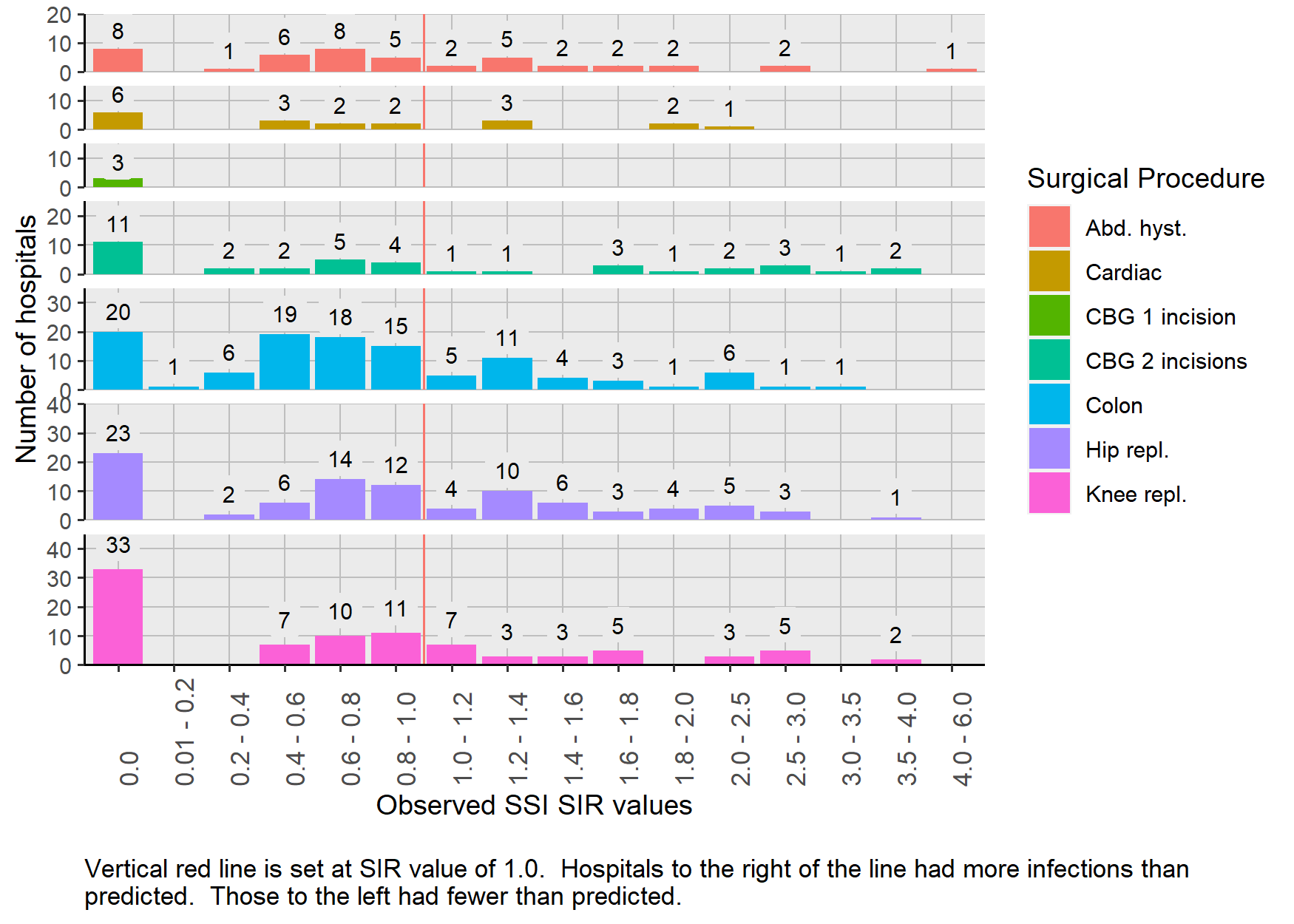 Table 14 shows the number of hospitals with statistically significant SSIs. Nearly 2 times as many hospitals have statistically significantly higher SIRs than those with SIRs statistically significantly lower SIRs. Of the 6 surgical procedures, colon procedures had the most facilities (n=6) with SIRs that were statistically significantly less than the 2015 national baseline. No hospitals had significantly fewer SSIs than the 2015 national baseline for abdominal hysterectomies, CBG with 2 incisions, hip replacement, and knee replacement. Several facilities had SIRs that were statistically significantly more than the 2015 national baseline for these procedures.