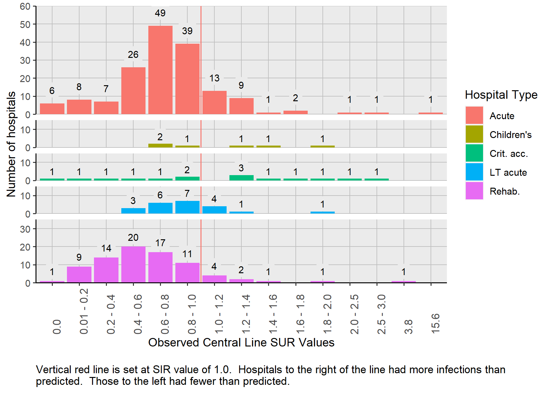 Fourteen hospitals reported no central line days, 61 reported between 1 and 200 central line days, 63 reported between 201 and 1,000 central line days, 91 reported between 1,001 and 5,000 central line days, 33 reported between 5,001 and 10,000 central line days, and 31 reported between 10,001 and 86,575 central line days. The central line SUR was calculated for all the facilities that reported data. The state SUR was 0.85 (95% CI: 0.85-0.85) which is 15% less use than predicted by the 2015 national baseline.