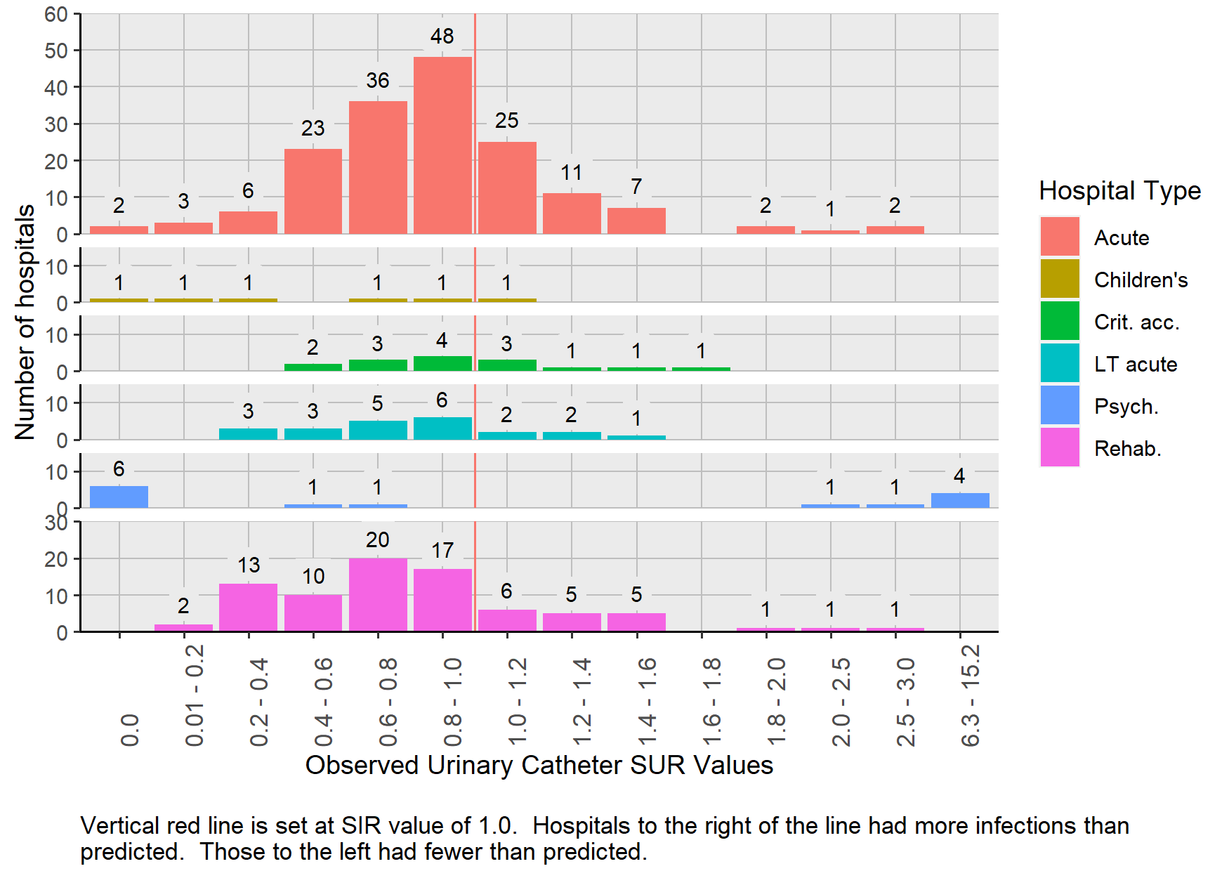 Figure 2 shows that the hospital-specific urinary catheter SUR values were dispersed and ranged from 0 to 15.2. Eighty-five (28%) of the 304 hospitals had SURs less than 1.0. Four psychiatric hospitals had SURs more than 6.0 (SUR: 15.2, 11.2, 6.8 and 6.3), meaning that urinary catheters were used 6 times greater than those of similar hospitals from the 2015 national baseline. The distribution of SURs in psychiatric hospitals is unique because 42% percent (N=6) had no urinary catheter use, while 42% percent (N=6) used urinary catheters 2 or more times compared to the 2015 national baseline.