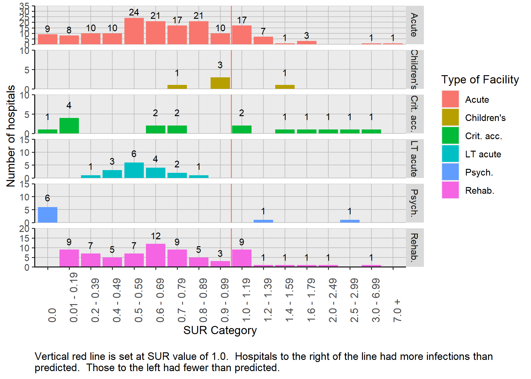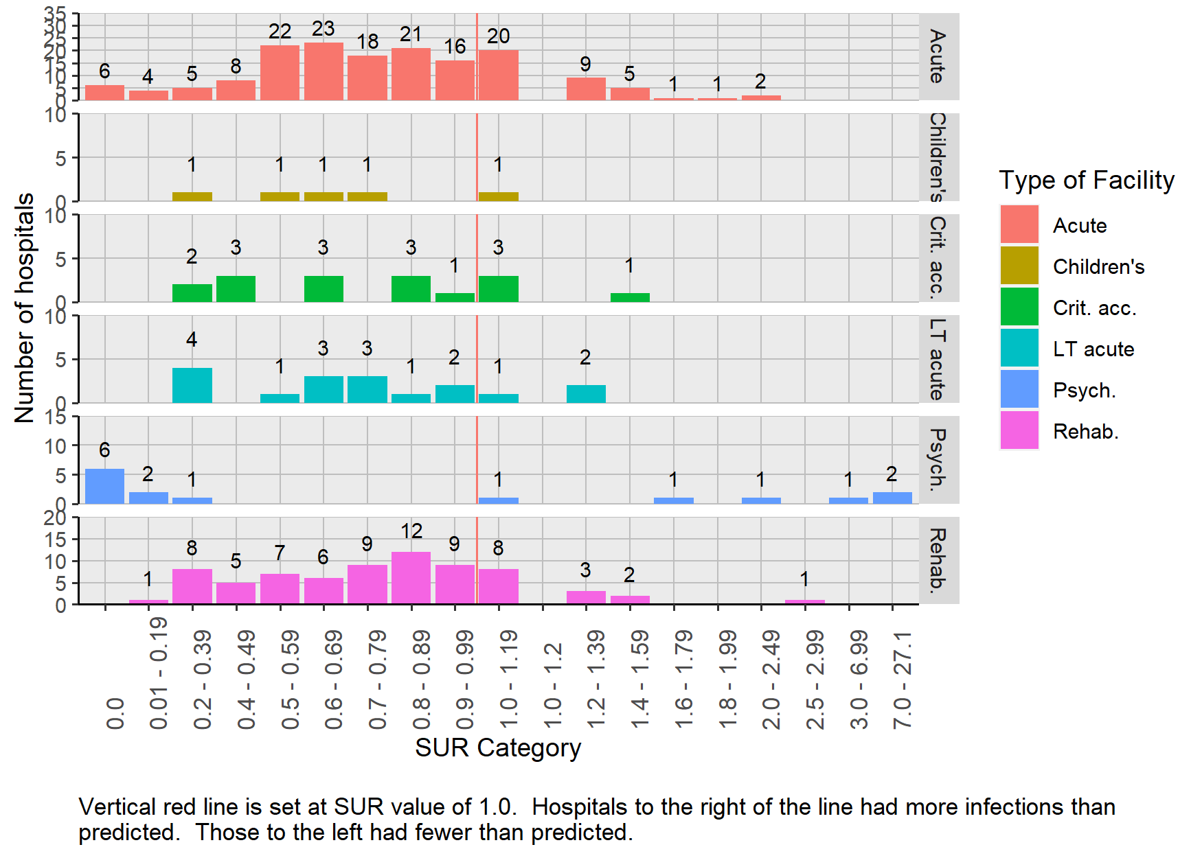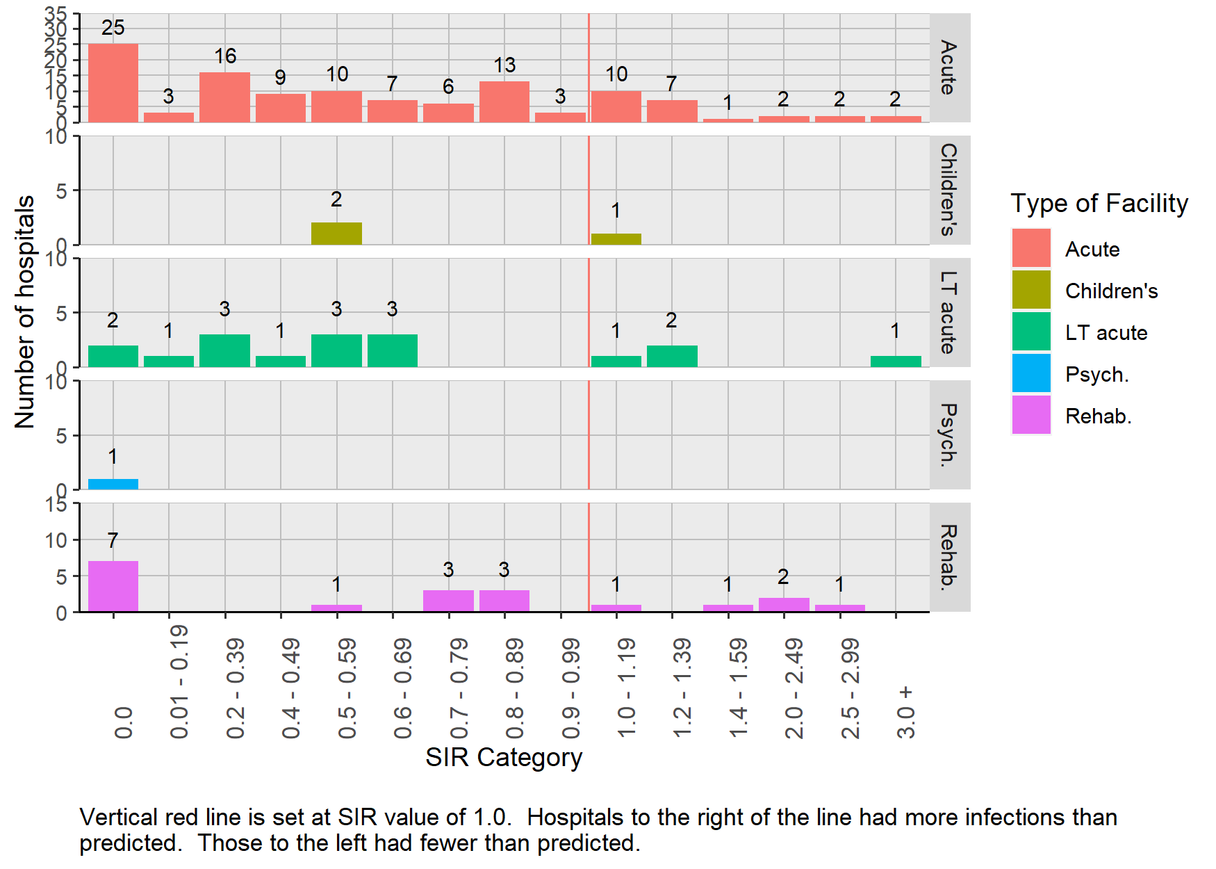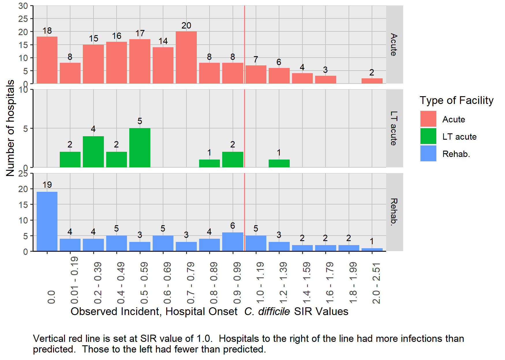 The SIR values among the 231 hospitals ranged from 0 to 2.51 The distribution among the 146 ACHs show that most SIR values (N = 124, 84.9%) are less than 1.0. Two ACHs and one IRF have SIR values more than 2.0. All but one LTAC hospital have a SIR value less than 1.0 (N = 15, 88.2%). Seventy-six percent (N=52) of IRFs have a SIR value less than 1.0.